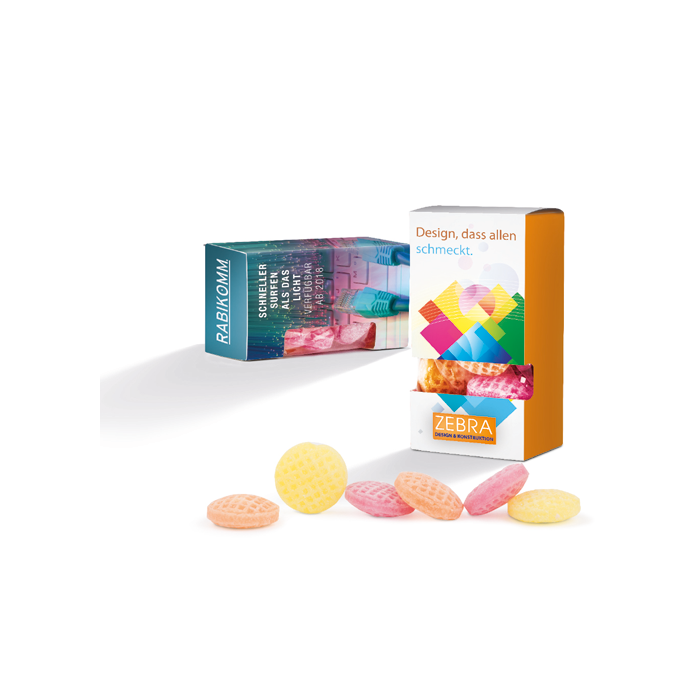 Dit creatieve snoepdoosje met venster is een originele manier om je bedrijf te promoten en tegelijk iets lekkers uit te delen. Doordat het doosje geheel naar eigen ontwerp kan worden vormgegeven, kun je er van maken wat je wilt. Hierdoor is het altijd van toepassing op jouw bedrijf! Denk aan een speaker of TV voor een elektronicabedrijf, een vrachtwagen voor een transportbedrijf, enzovoort.